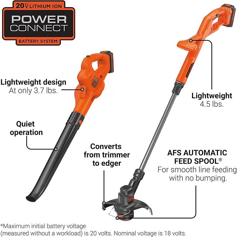 INCLUDES: (1) LST201 20V MAX* cordless trimmer/edger, (1) LSW221 20V MAX* cordless sweeper, (2) LBXR20 20V MAX* POWERCONNECT battery, (1) charger, (1) blow tube, (1) AFS spool, (1) guard. Easily converts from trimmer to wheeled edger.