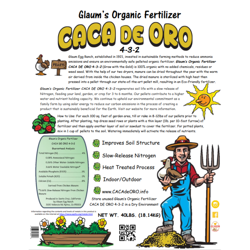 Introducing Caca de Oro 100% dried chicken manure fertilizer, sourced directly from the lush Santa Cruz County area, where sustainability meets excellence. Derived from the esteemed Glaum Egg Ranch, a cherished family-owned, cage-free egg farm renowned for its commitment to quality. Our Organic fertilizer begins its journey as chicken manure, meticulously transformed into premium, all-natural Organic fertilizer pellets.
