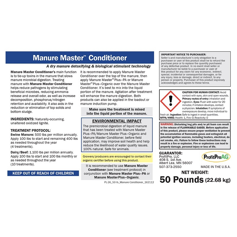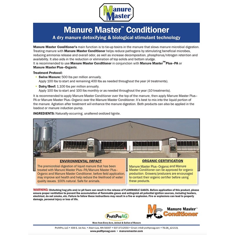 It is recommended to apply Manure Master™ Conditioner over the top of the manure, then apply Manure Master™ Plus - PA or Manure Master Plus - Organic over the Manure Master™ Conditioner. It's best to mix into the liquid portion of the manure. Agitation after treatment will enhance the manure digestion. Both products can also be applied in the loadout or manure induction pump.