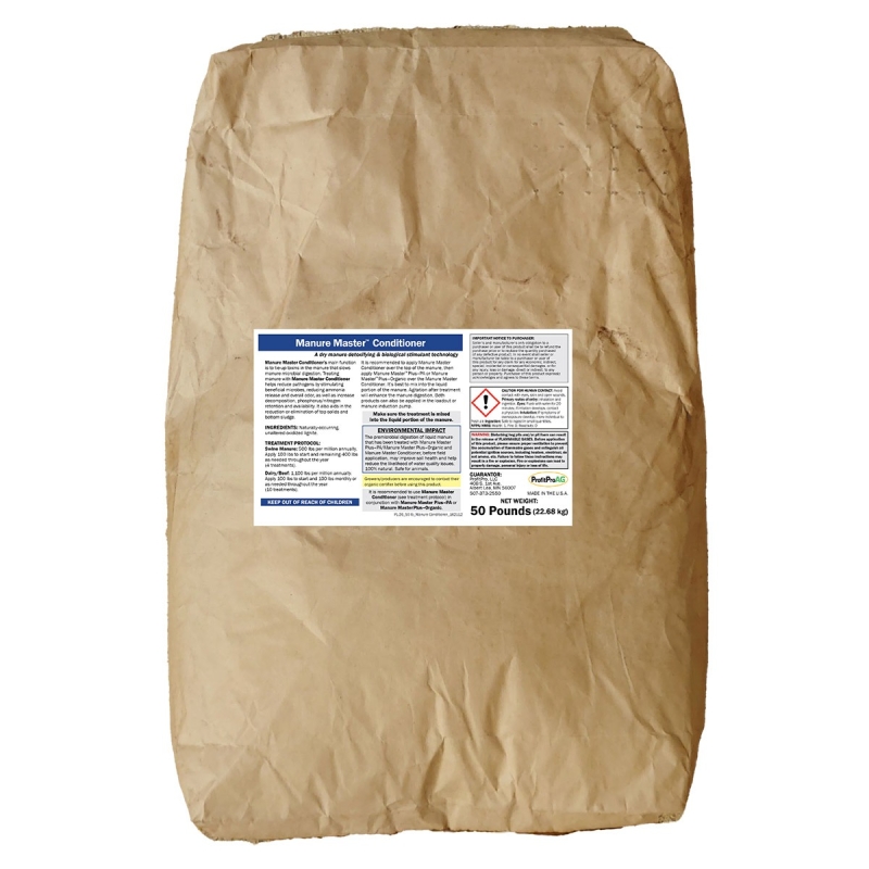 Manure Master™ Conditioner’s main function is to tie-up toxins in the manure that slows manure microbial digestion. Treating manure with Manure Master™ Conditioner helps reduce pathogens by stimulating beneficial microbes, reducing ammonia release and overall odor, as well as increasing decomposition, phosphorus/nitrogen retention and availability. It also aids in the reduction or elimination of top solids and bottom sludge.